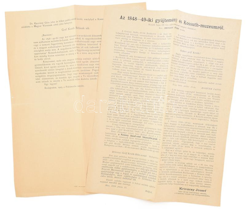 1907 gr. Kreith Béla 1848-as ereklyegyűjteménye és Kossuth múzeum elzárt termeinek fényképe és a nyilvánosság előtt való megnyitásukról szóló cikkek egy röplapon 20x30 cm