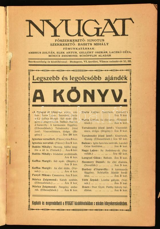 1909-1919-1926 Nyugat 4 száma, közte 1919. 1. sz. és 9-10. számok is. Változó állapotban, közte egy széteső állapotúval, szakadozott borítókkal, közte egy foltos is.