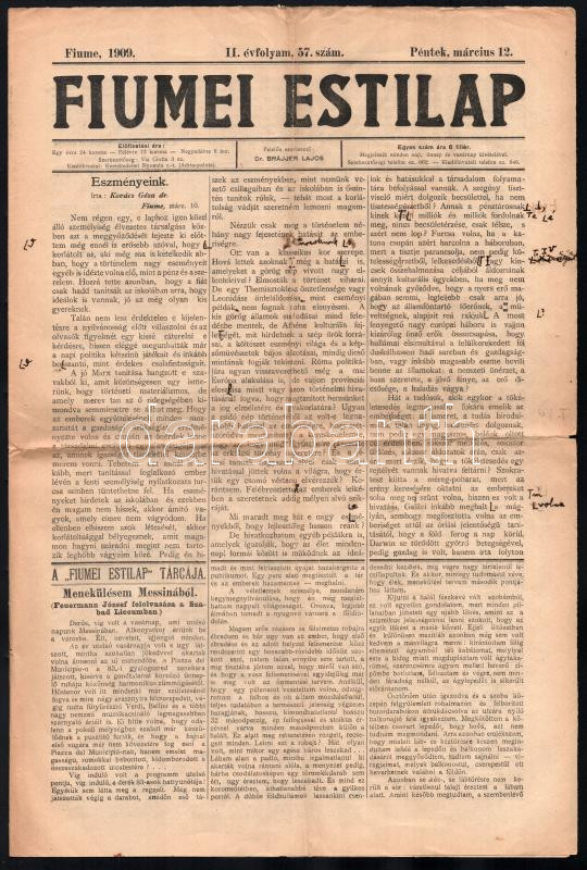 Leírás: 1909 Fiumei Estilap II. évf. 57. sz., 1909. márc. 12., szerk.: Dr. Brájjer Lajos, néhány apró sérüléssel, 4 p.
