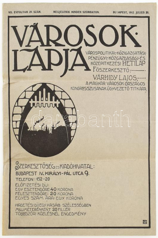 1912 Városok Lapja. Várospolitikai, pénzügyi, közigazgatási, és középí... https://www.darabanth.com/hu/448-Gyorsarveres/448.0/Mutargy-papirregiseg-egyeb/Nyomtatvanyok~2000005/1912-Varosok-Lapja-Varospolitikai-penzugyi-kozigazgatasi-es-kozepitkezesi-hetilap-sz~II2967001