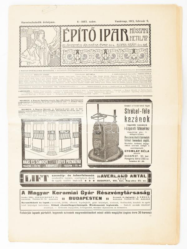 Leírás: 1913 Az Építőipar 37. évf 6 száma. benne a nemzeti színház tervpályázatával, Jakabffy Gyula terveivel