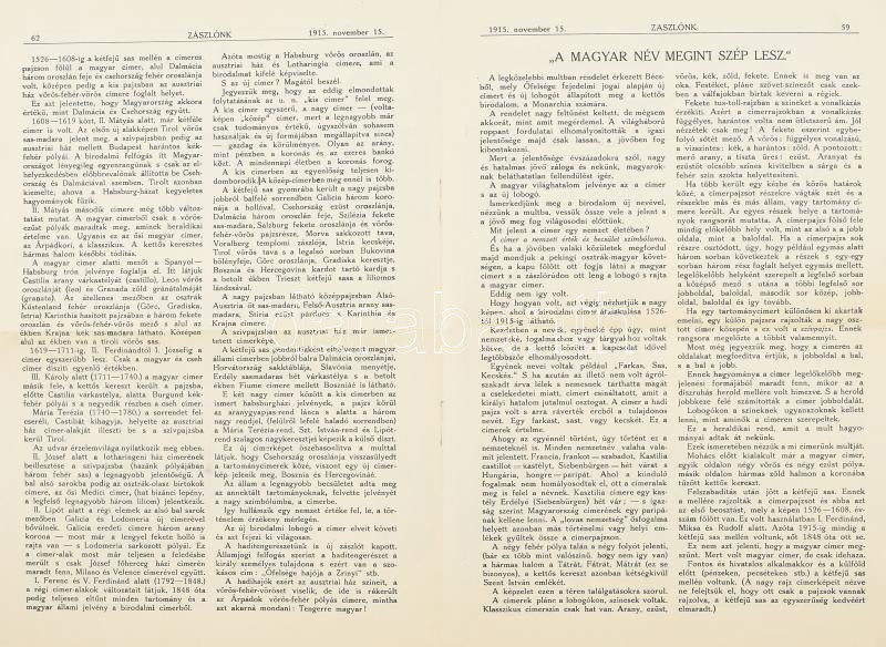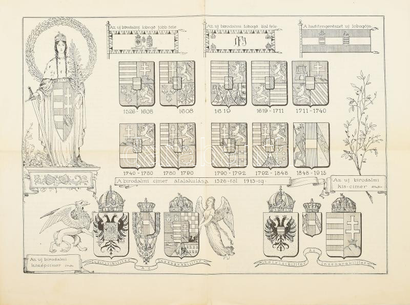 Leírás: 1915 A birodalmi címer átalakulása 1526-tól 1915-ig, a Zászlónk c. újság 1915. nov. 15-i számából, apró lapszéli sérülésekkel, 40x29,5 cm