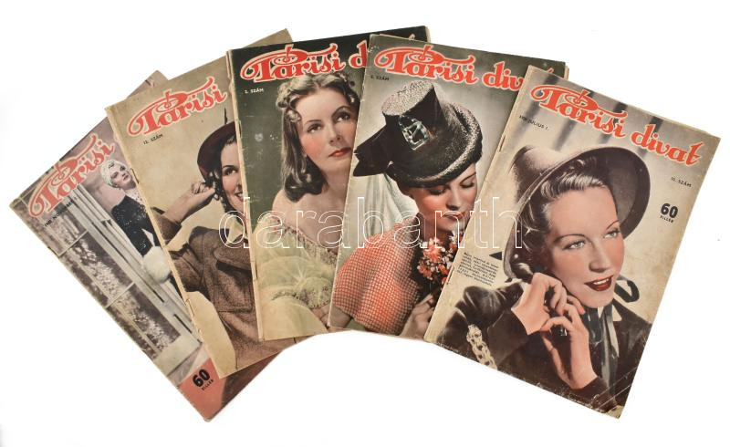 1938-1941 Párisi Divat c. folyóirat 5 db száma, változó állapotban https://www.darabanth.com/hu/448-Gyorsarveres/448.0/Mutargy-papirregiseg-egyeb/Nyomtatvanyok~2000005/1938-1941-Parisi-Divat-c-folyoirat-5-db-szama-valtozo-allapotban~II2971900