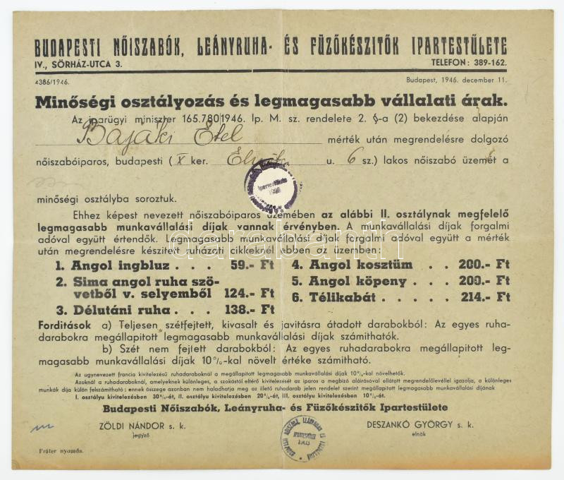 1946 Minőségi osztályozás és legmagasabb vállalati árak. Budapesti Nőiszabók, Leányruha- és Fűzőkészítők Ipartestülete. Bélyegzőkkel, hajtásnyomokkal, 26,5x23 cm