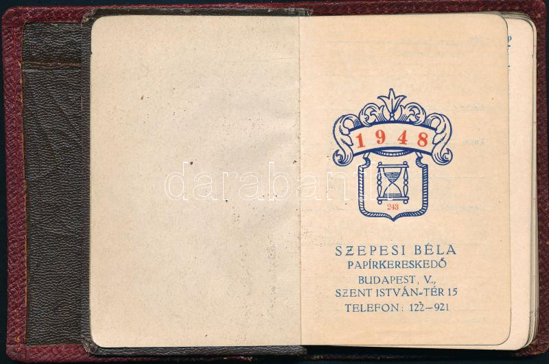 1948 Zsebnaptár, Szepesi Béla papírkereskedő, kitöltetlen, kissé kopot... https://www.darabanth.com/hu/448-Gyorsarveres/448.0/Mutargy-papirregiseg-egyeb/Nyomtatvanyok~2000005/1948-Zsebnaptar-Szepesi-Bela-papirkereskedo-kitoltetlen-kisse-kopott-boritoval~II2968234