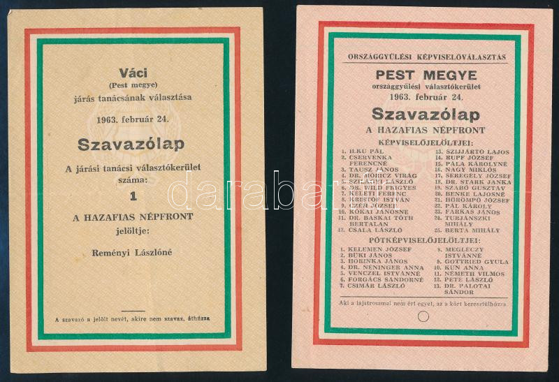 1963 Hazafias Népfront választási szavazólapok, 4 db különféle https://www.darabanth.com/hu/448-Gyorsarveres/448.0/Mutargy-papirregiseg-egyeb/Nyomtatvanyok~2000005/1963-Hazafias-Nepfront-valasztasi-szavazolapok-4-db-kulonfele~II2939552