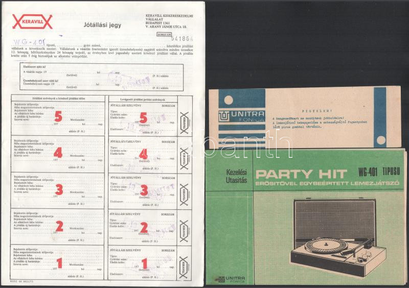 Leírás: Unitra által kiadott WG-401 típusú erősítővel egybeépített lemezlejátszó kezelési útmutatója, valamint jótállási jegye 1975. okt. 03-ból.