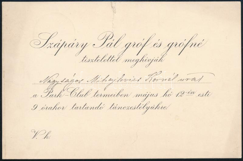 cca 1900 Szapáry Pál gróf (1873-1917) fiumei kormányzó és felesége táncestélyének meghívója, Mihailovics Kornélnak címezve, tetején szakadással, 16,5x10,5 cm