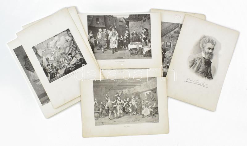 Leírás: cca 1910-1930 Munkácsy Mihály arcképe és műveinek reprodukciói, 13 db fekete-fehér nyomat, vegyes állapotban, lapméret: 24,5x16 cm