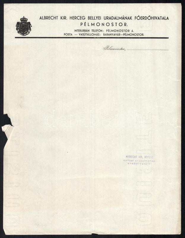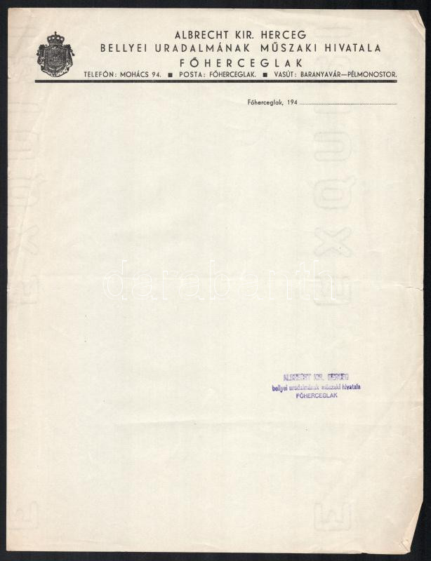 cca 1940 Főherceglak (Kneževo), Albrecht Kir. Herceg Bellyei Uradalmának Jószágigazgatósága 3 db kitöltetlen, fejléces papírja, bélyegzőkkel, kisebb lapszéli sérülésekkel