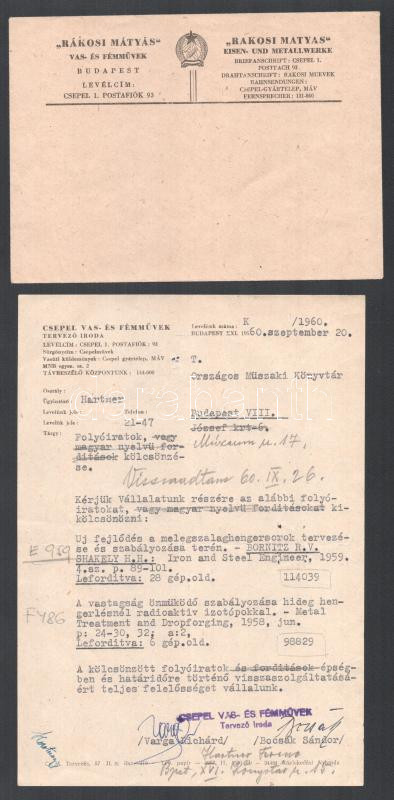 Leírás: cca 1950-1960 Csepel- / "Rákosi Mátyás" Vas- és Fémművekkel kapcsolatos nyomtatványok, borítékok...stb, 9 db.
