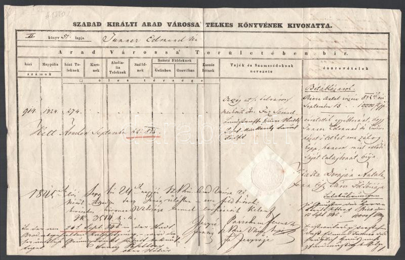 Leírás: 1845 Arad, telekkönyvi kivonat, papírfelzetes viaszpecséttel, középen hajtott, 40,5x25,5 cm