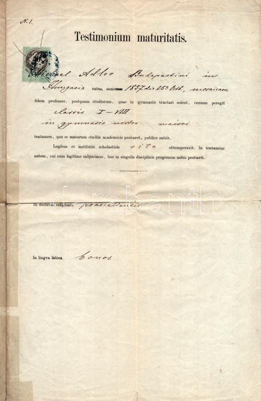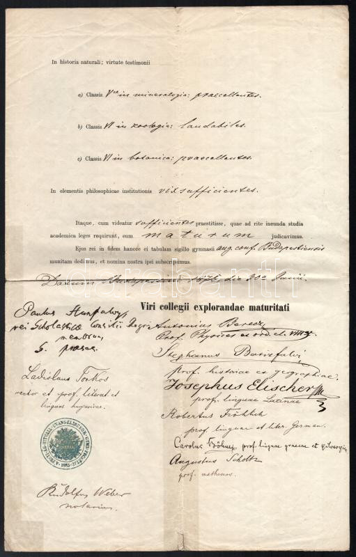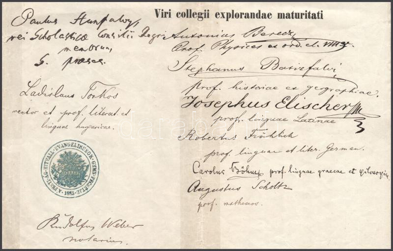 1875 Budapesti Ág. Hitv. Ev. Főgymnasium (Deák Téri Evangélikus Gimnázium) érettségi bizonyítványa, rajta Torkos László (1839-1939) igazgató, író, műfordító, Hunfalvy Pál (1810-1891) iskolafelügyelőnek (1853-1883), jogász, etnográfus, nyelvész, országgyűlési képviselő, Berecz Antal (1836-1908) földrajz-és természettudós, Batizfalvy István (1824-1899) főgimnáziumi tanár, szakíró, szerkesztő, Elischer József (1843-?) főgimnáziumi tanár, szakíró, Fröhlich Róbert (1844-1894) református lelkész, régész, MTA főkönyvtárnoka, Böhm Károly (1846-1911) filozófus, Schlotz Ágoston (1844-1916) matematikus, Weber Rudolf (1843-1915) főgimnáziumi tanár aláírásaival, 50 kr okmánybélyeggel, az iskola pecsétjével, hajtott, javított-