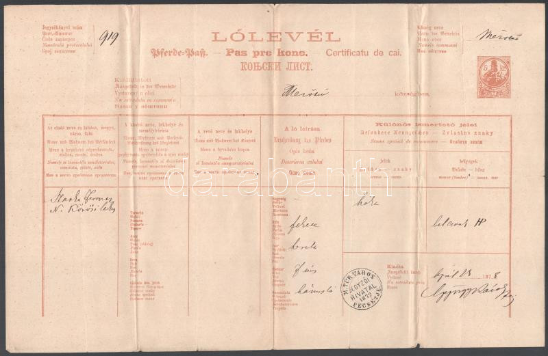 1878 Lólevél Mezőtúr, 5kr díjjegyes https://www.darabanth.com/hu/448-Gyorsarveres/448.0/Mutargy-papirregiseg-egyeb/Okmanyok~1000031/1878-Lolevel-Mezotur-5kr-dijjegyes~II2966770