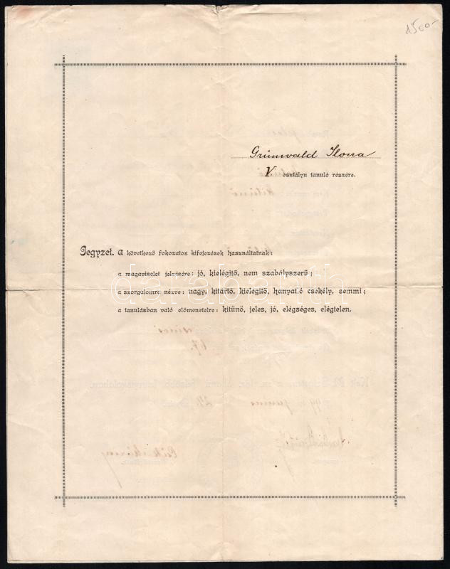 Leírás: 1899 Máramarosszigeti m. kir. állami felsőbb leányiskola bizonyítványa izr. tanuló részére kis szakadással
