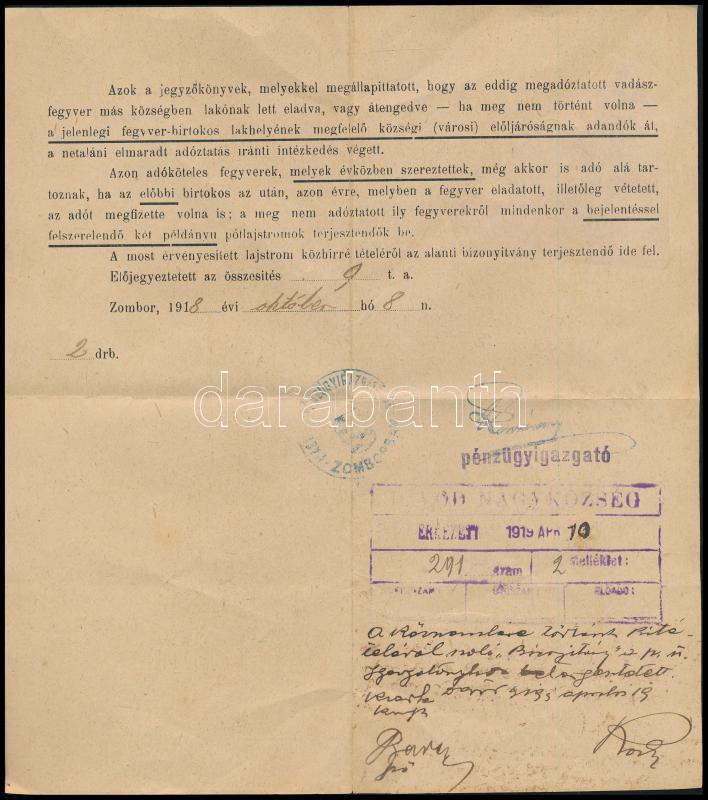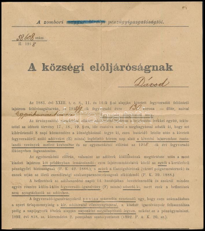 1918.X.8. Zombor (Vajdaság), a zombori pénzügyigazgatóság hirdetménye az 1918/19. évre megállapított fegyveradó összegéről, Dávod község elöljáróságának címezve. (A fejlécen a "magyar királyi" részt áthúzták, a bélyegzőn a "Kir." részt, illetve a címerről a koronát eltávolították.)