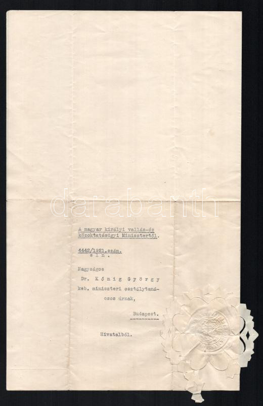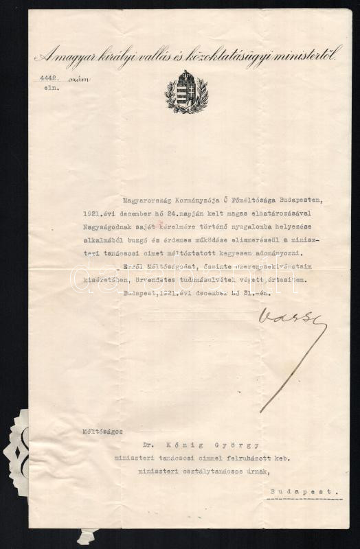 1921 Vass József (1877-1930) vallás és közoktatásügyi miniszter (Bethlen-kormány, 1921. április 14.-1922. június 16.) autográf aláírása egy miniszteri tanácsosi címet adományozó okiraton, nyugállományba vonulás alkalmából, fejléces papíron, Bp., 1921. dec. 31.