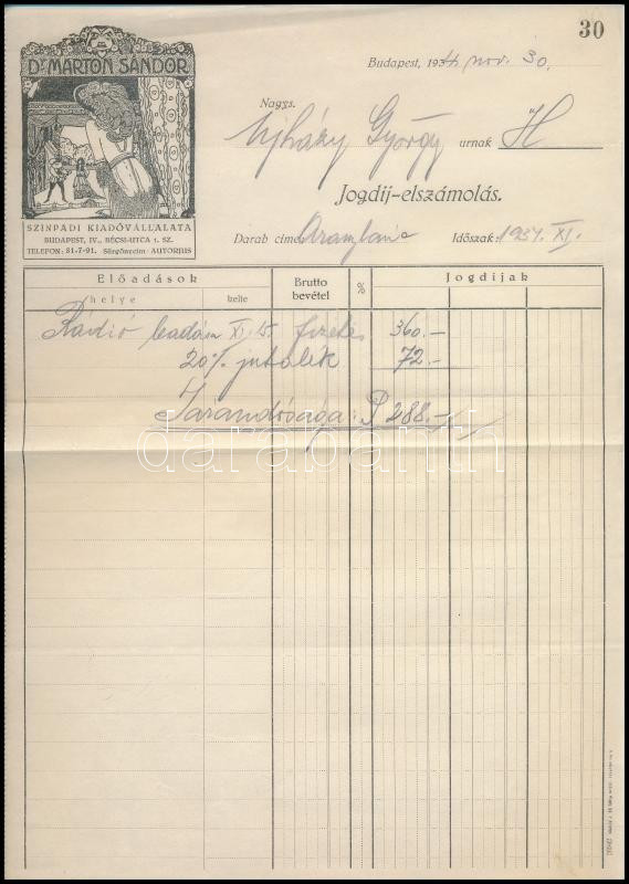 1934 Dr. Marton Sándor Színpadi Kiadóvállalatának 3 db számlája szecessziós díszítéssel, Ujházy György író részére. + Ujházy György: Szent Gellért templomjátéka, 31p