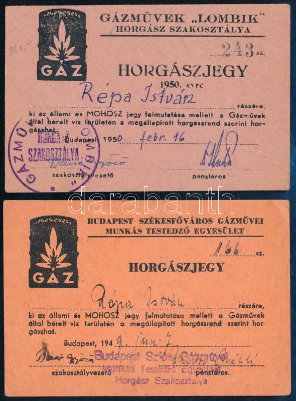 1949-1950 Bp., Gázművek horgász szakosztálya által kiállított horgászj... https://www.darabanth.com/hu/448-Gyorsarveres/448.0/Mutargy-papirregiseg-egyeb/Okmanyok~1000031/1949-1950-Bp-Gazmuvek-horgasz-szakosztalya-altal-kiallitott-horgaszjegyek-2-db-kulonbo~II2969162