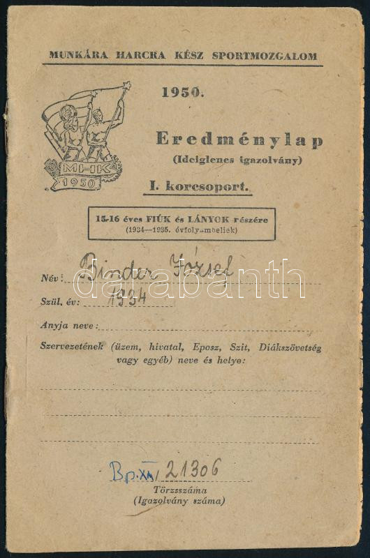 Leírás: 1950 Munkára Harca Kész Sportmozgalom (MHK) eredménylap (ideiglenes igazolvány), I. korcsoport