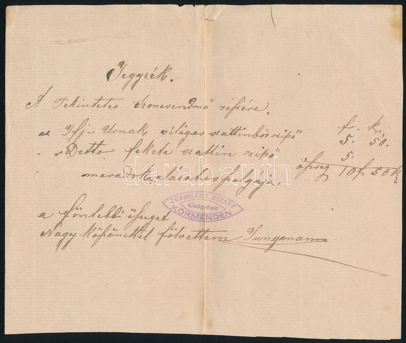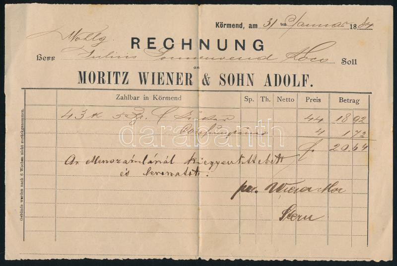 cca 1884 Körmend, 2 db számla (Jungmann József cipész, Moritz Wiener &... https://www.darabanth.com/hu/448-Gyorsarveres/448.0/Mutargy-papirregiseg-egyeb/Okmanyok~1000031/cca-1884-Kormend-2-db-szamla-Jungmann-Jozsef-cipesz-Moritz-Wiener-Sohn-Adolf~II2972421