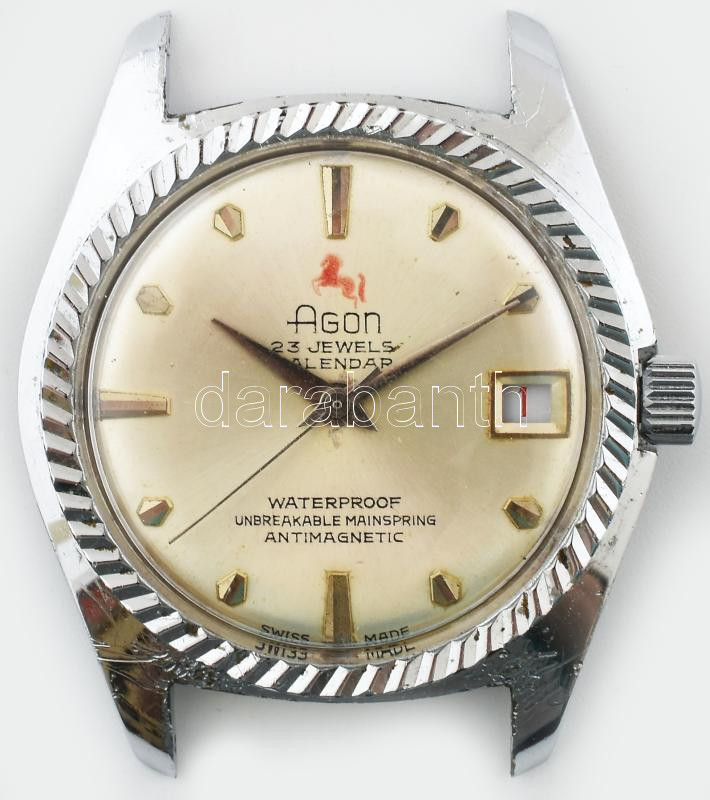 Leírás: Agon kézi felhúzós férfi karóra, nem működik, szép számlappal. d: 33 mm