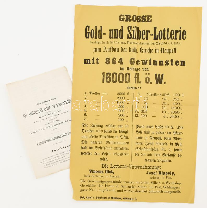 Leírás: 1873 Ujpest, Jótékony célú arany- és ezüst-sorsjáték az ujpesti katholikus templom felépítésére. Játékterv 4p + plakát 30x48 cm