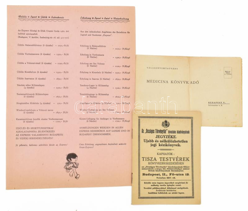 3 db reklámnyomtatvány: cca 1928 Az "Országos Törvénytár" hivatalos kiadványainak jegyzéke. Bp., Tisza Testvérek kiadása (Neuwald Illés utódai-ny.), 8 sztl. lev. + cca 1970 Medicina Könyvkiadó megrendelőlapja + 1982 Express Ifjúsági és Diák Utazási Iroda 1982. évi belföldi ajánlataiból