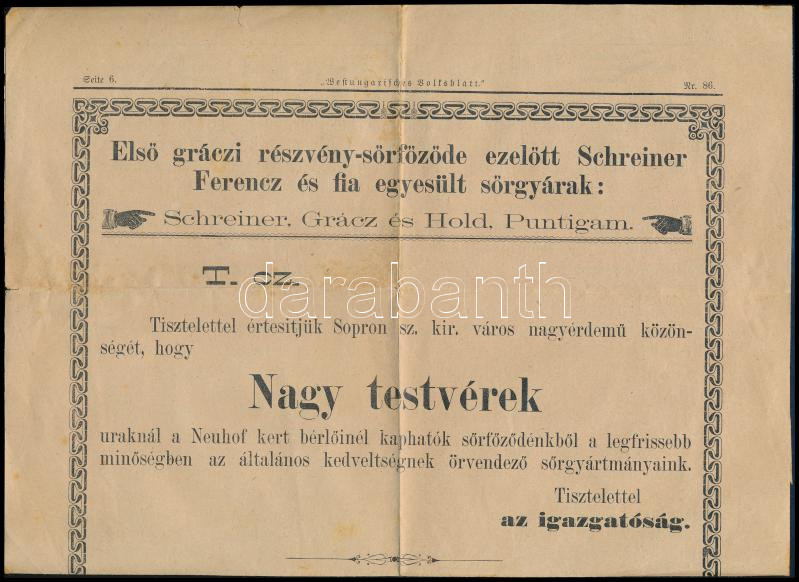 Vegyes reklám tétel, 6 db, közte Gundel (Szt. Gellért Szálló) menükártya (1939, sérült), Radion számla, használt Neoshampon tasak, Julius Meinl Maltinkakaó, Modiano szivarkahüvely doboztető, Első Gráczi Részvény-Sörfőzde gyártmányai soproni Neuhof-kertben található Nagy testvéreknél kaphatóak (újságlap.)