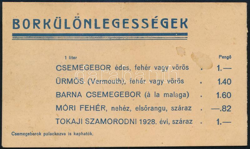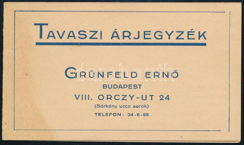 Leírás: cca 1928 Grünfeld Ernő tavaszi árjegyzéke, benne borárlappal és más italokkal is, 2 sztl. lev., 7x12 cm