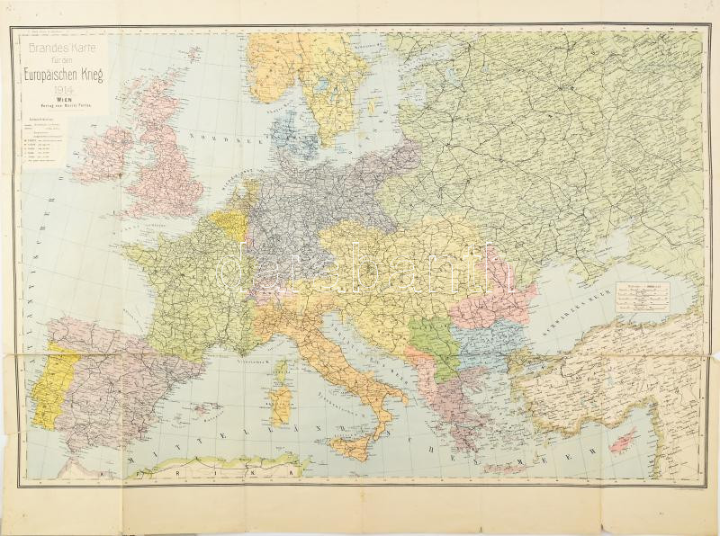 Leírás: Brandes' Karte für den Europäischen Krieg 1914 / Európa térképe az I. világháború idején, 1 : 5.000.000, Wien, Moritz Perles, sérülésekkel, 90x69 cm