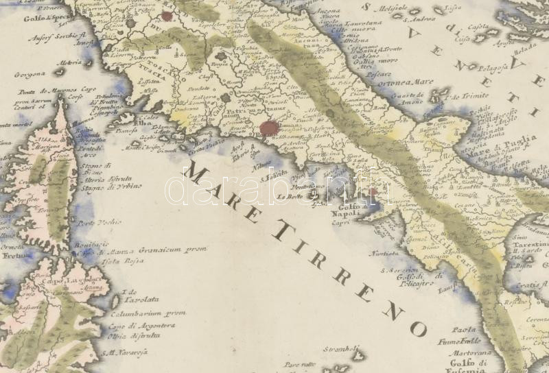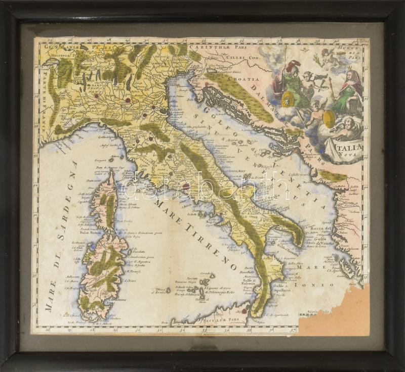 Cluver, Philipp (1580-1622) - Senex, John (1690-1740): Italia Nova. Színezett, rézmetszetű térkép, XVIII. sz. eleje. Szélein körbevágott, néhány apró lyukkal, jobb alsó sarkán hiánnyal. Üvegezett fakeretben, 30,5x26 cm.