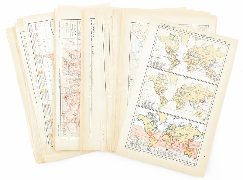 Leírás: cca 1900 kb. 68 db térkép a Pallas, Brockhaus és Meyer's Lexikonból, néhány kevés sérült, 24x16 cm