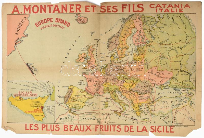 cca 1920-1930 A. Montaner et ses fils Catania Italie, les plus beaux fruits de la Sicile / Európa térképe, rajta nemzetközi kereskedelmi-szállítási útvonalak jelölésével. Giusto & Nicolosi, Catania. Sérülésekkel, 45x30 cm