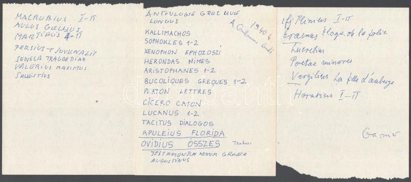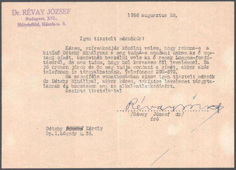 1956 Révay József (1881-1970) klasszika-filológus érdeklődő levele Détshy Károly mérnök részre, amelyben érdeklődik, hogy rokona-e Détshy Mihálynak, mert szeretne a Longos fordításáról beszélni vele, saját kezű aláírásával. + 2 db jegyzetlap