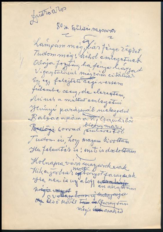 Leírás: 1961 Dutka Ákos (1881-1972) költő, író saját kézzel írt, "80.-ik születésnapomra" c. versének kézirata, aláírással, 1 beírt oldal.