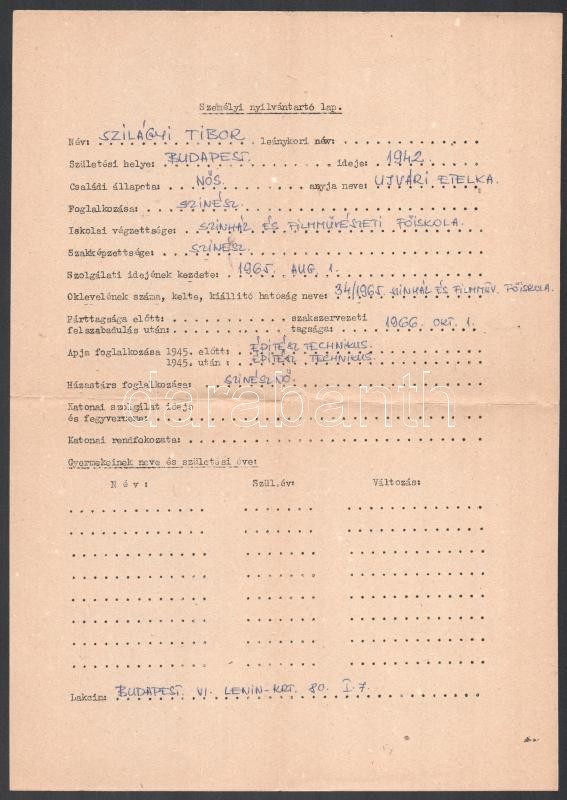 1969 Szilágyi Tibor (1942-) Kossuth- és Jászai Mari-díjas színművész, rendező, színházigazgató, érdemes és kiváló művész, a Halhatatlanok Társulatának örökös tagjának személyi nyilvántartó lapja és autográf aláírásával ellátott önéletrajza, egy kézzel írt oldal.