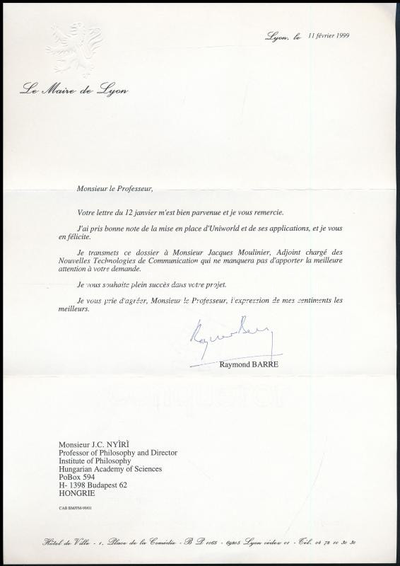 1999 Raymond Barre (1924-2007) francia közgazdász, politikus, Lyoni polgármester gépelt levele Nyíri János Kristóf (1944-) Széchenyi-díjas filozófus, egyetemi tanár, MTA Filozófiai Kutatóintézetének igazgatója részére, autográf aláírással, fejléces papíron.