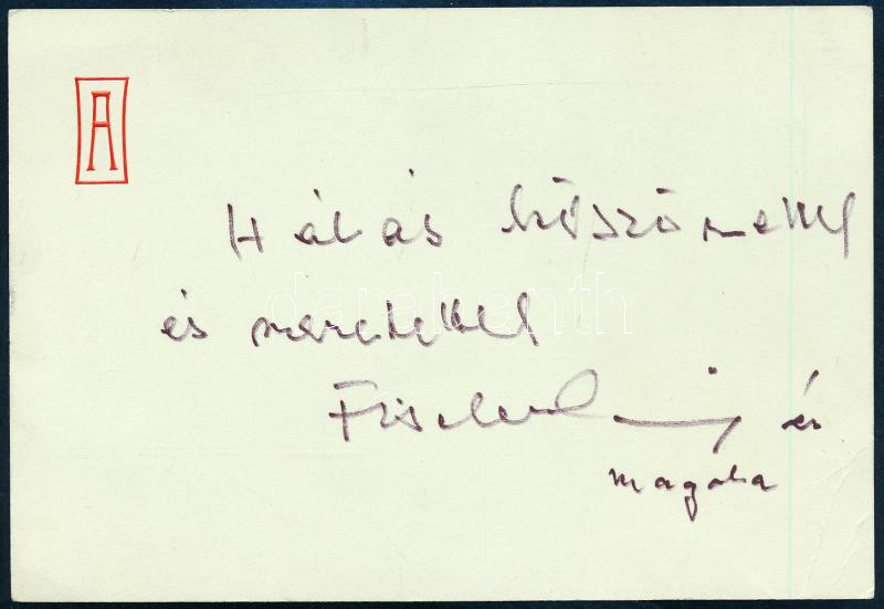 Fischer Annie (1914-1995) a 20. század egyik legnagyobb, háromszoros Kossuth-díjas magyar zongoraművészének saját kezű üdvözlő sorai, Fischer Annie és húga, Fischer Magda (1917-2011) zongoratanárnő aláírásával.