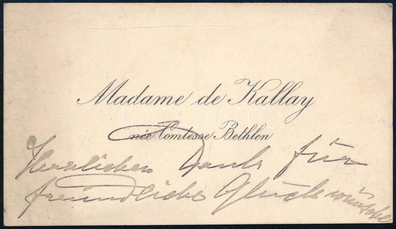 cca 1880-1910 Kállay Béniné Bethlen Vilma grófnő (1850-1940) autográf német nyelvű köszönő sorai saját névjegykártyáján. Férje Nagykállói Kállay Béni (1839-1903) politikus, diplomata, történész, az Osztrák-Magyar Monarchia közös pénzügyminisztere (1882-1903).
