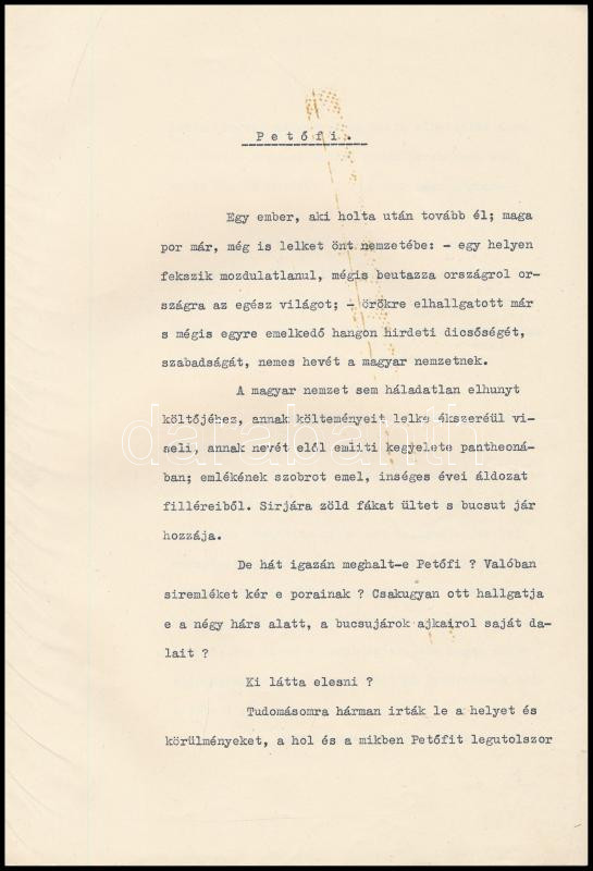Leírás: cca 1940 Petőfi emlékére írt vers gépirata