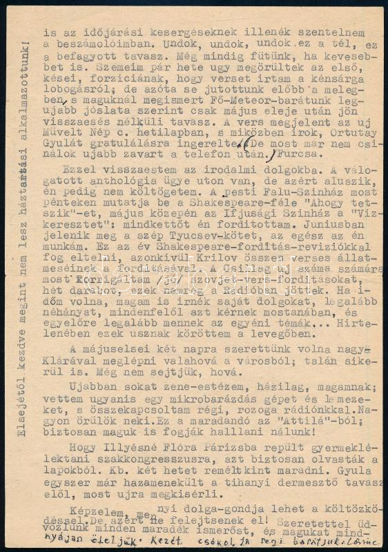cca 1954 Szabó Lőrinc (1900-1957) író gépelt levele, "Kedves Riza és Béla!" megszólítással, benne autográf javításokkal, autográf aláírásával, 2 gépelt oldal.