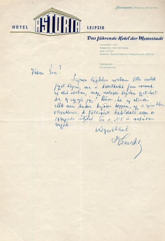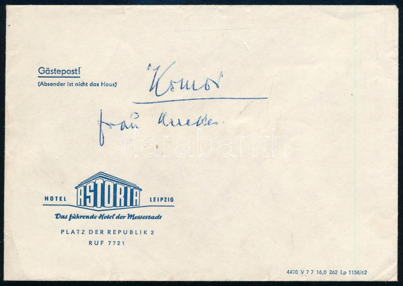 cca 1960 Komor Vilmos (1895-1971) Liszt- és Kossuth-díjas karmester saját kézzel írt levele, "Kedves Éva!" megszólítással, Kerekes János (1913-1996) zeneszerző, karmester felesége részére, autográf aláírással, borítékkal.