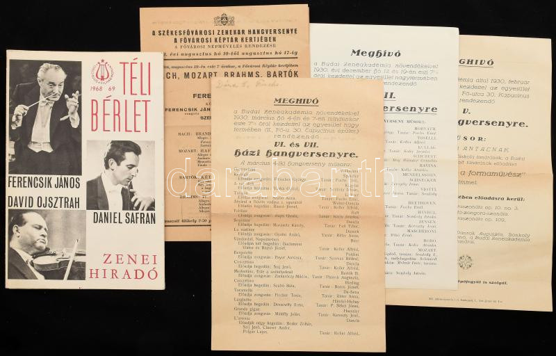 1930 Budai Zeneakadémia hangverseny meghívók, 3 db + 1943 A Székesfővárosi Zenekar hangversenye a Fővárosi Képtár kertjében, műsorprospektus + 1968-69 Országos Filharmónia Téli bérlet műsora