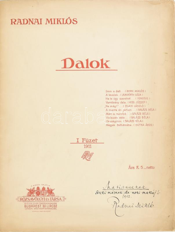 Radnai Miklós (1892-1935) zeneszerző, színházigazgató által Adler Marianne izraelita származású zongoratanárnő, Szendy Árpád (1863-1922) zongoraművész és - tanár, zeneszerző tanítványának részére DEDIKÁLT kotta: Dalok. I. füzet. Bp., 1911, Rózsavölgyi, 23 p.