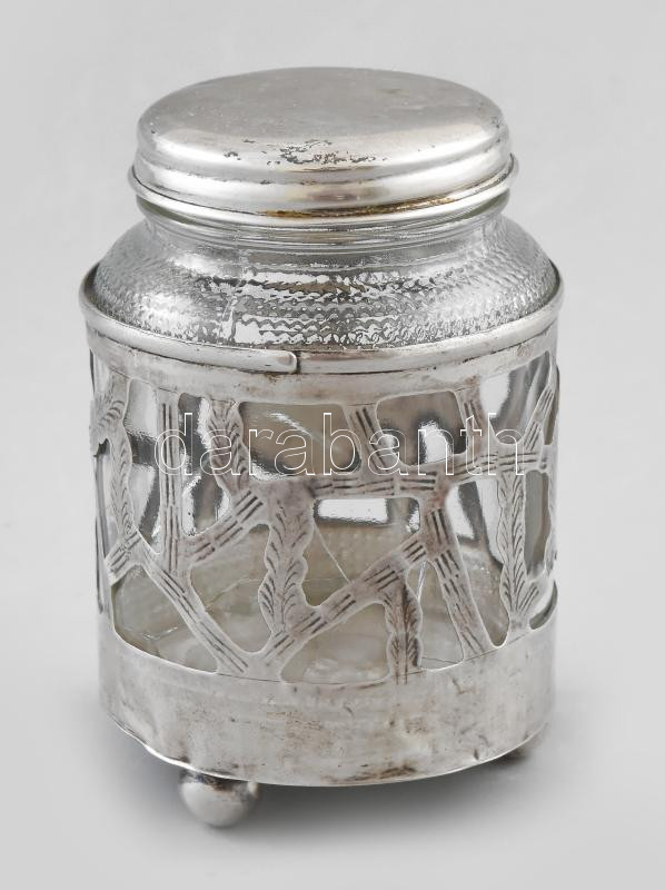 Leírás: Antik üveg fűszertartó ezüst (Ag) szerelékkel, törött üveggel, ezüst (Ag) fedővel, jelzéssel, sérüléssel, m: 10 cm