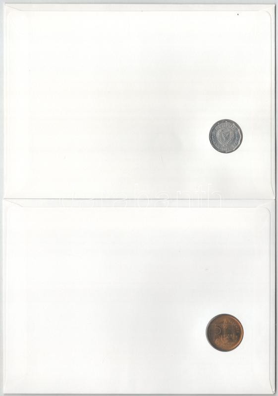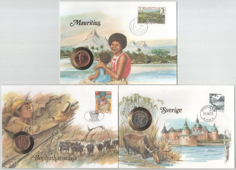 5db-os érmés boríték tétel, mind különféle és német nyelvű tájékoztatóval, benne: Mauritius, Dél-Afrika / Bophuthatswana, Svédország, Török-Ciprus, Lesotho
