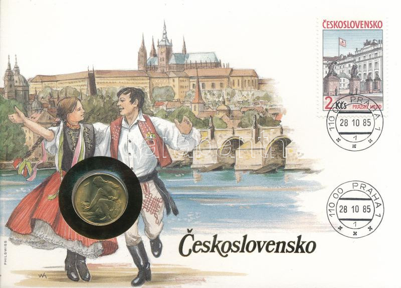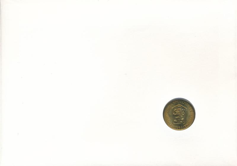Csehszlovákia 1985. 1K Al-bronz felbélyegzett borítékban, bélyegzéssel, német nyelvű leírással T:AU Czechoslovakia 1985. 1 Koruna Al-bronze in envelope with stamp, cancellation and a prospectus in german C:AU