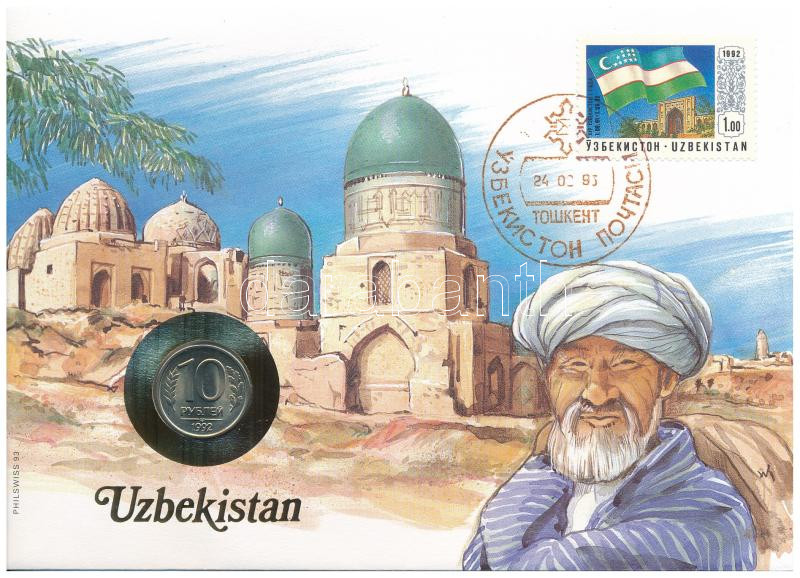 Üzbegisztán felbélyegzett borítékban, bélyegzéssel, német nyelvű tájékoztatóval, benne Oroszország 1992. 10R Cu-Ni T:UNC Uzbekistan in envelope with stamp, cancellation and a prospectus in german, in it Russia 1992. 10 Rubles Cu-Ni C:UNC
