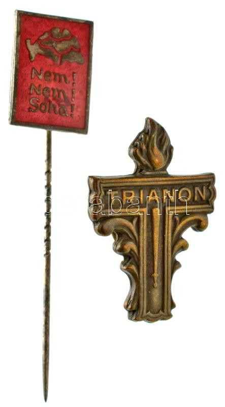 Leírás: ~1920. "Nem! Nem! Soha!" zománcozott fém kitűző (18x13mm) + DN "Trianon" festett bronz modern gyászjelvény pillangócsattal (30x21mm) T:XF